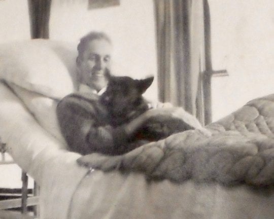 Pets are a source of companionship and joy for us now, just as they were for the TB patients of the past. During the TB years, many patients spent two years or more, mostly in bed. Cut off from family and friends, patients were often lonely, scared, and anxious. Animals provided friendship and distraction from worry. Some wealthy patients rented entire houses for their cure, and they were able to bring their pets with them to Saranac Lake. John Black came from Mansfield, Ohio, with his dog, Buddy. Sadly, John eventually lost his struggle against TB, and the John Black Room Room at the Saranac Laboratory Museum was built in his memory. In this photo, John looks very frail, but you can see how happy he was to be with his dog.
